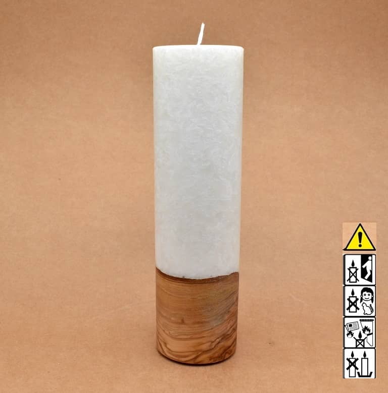 Runde Kerze in Stearinoptik 70 x 250 mm mit Holz und mit Dochteinsatz.