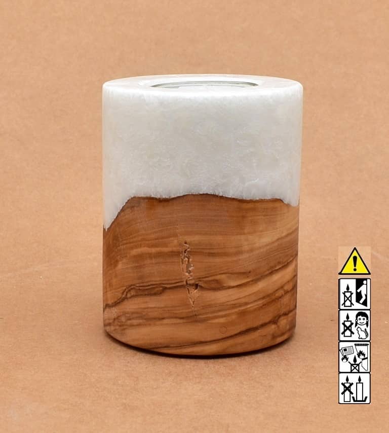 Es dürfen bei den Kerzen mit Holzelement nur Teelichter aus Paraffin mit Aluminium Hüllen max. Ø=38mm, Höhe=17mm und 6h Brenndauer verwendet werden, da sonst die Hitze für den Korpus zu groß wird. Bei Teelichter in Kunststoffhülle, oder Teelichter ohne Alu-Hülle, bei farbigen Teelichter und bei Teelichter aus Bienenwachs oder Palmöl kann der Korpus beschädigt werden.