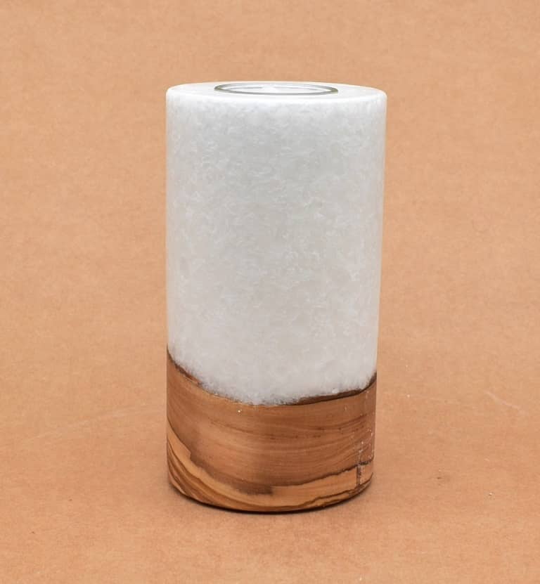 Runde Kerze in Stearinoptik 80 x 150 mm mit Teelicht und Holz.