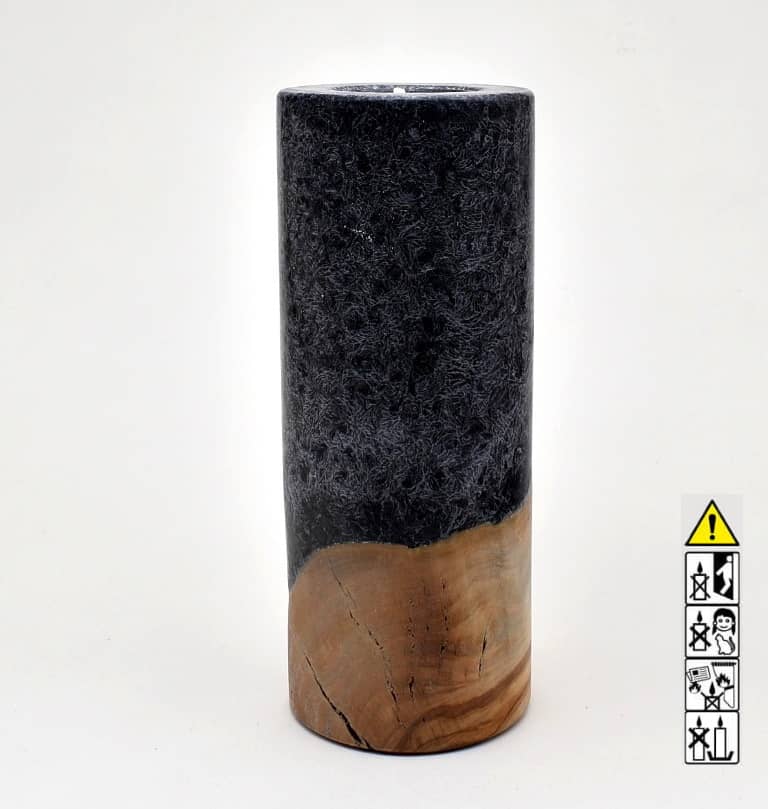 Runde Kerze in Stearinoptik 80 x 200 mm mit Teelicht und Holz in schwarz.