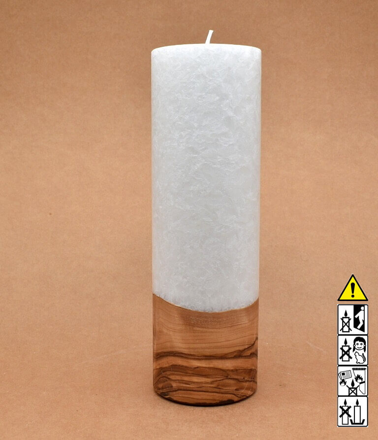 Runde Kerze in Stearinoptik 80 x 250 mm mit Holz und mit Dochteinsatz.