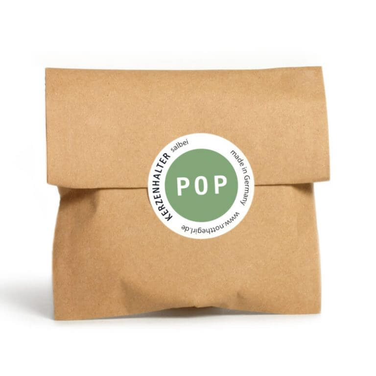 Verpackt wird POP in einer umweltfreundlichen braunen Naturpapiertüte mit Farbpunktaufkleber, der die jeweilige Farbvariante kennzeichnet.